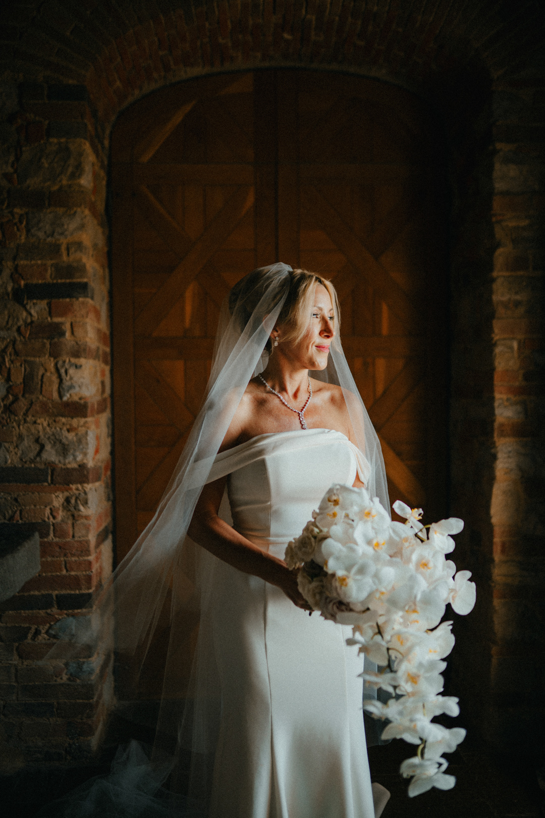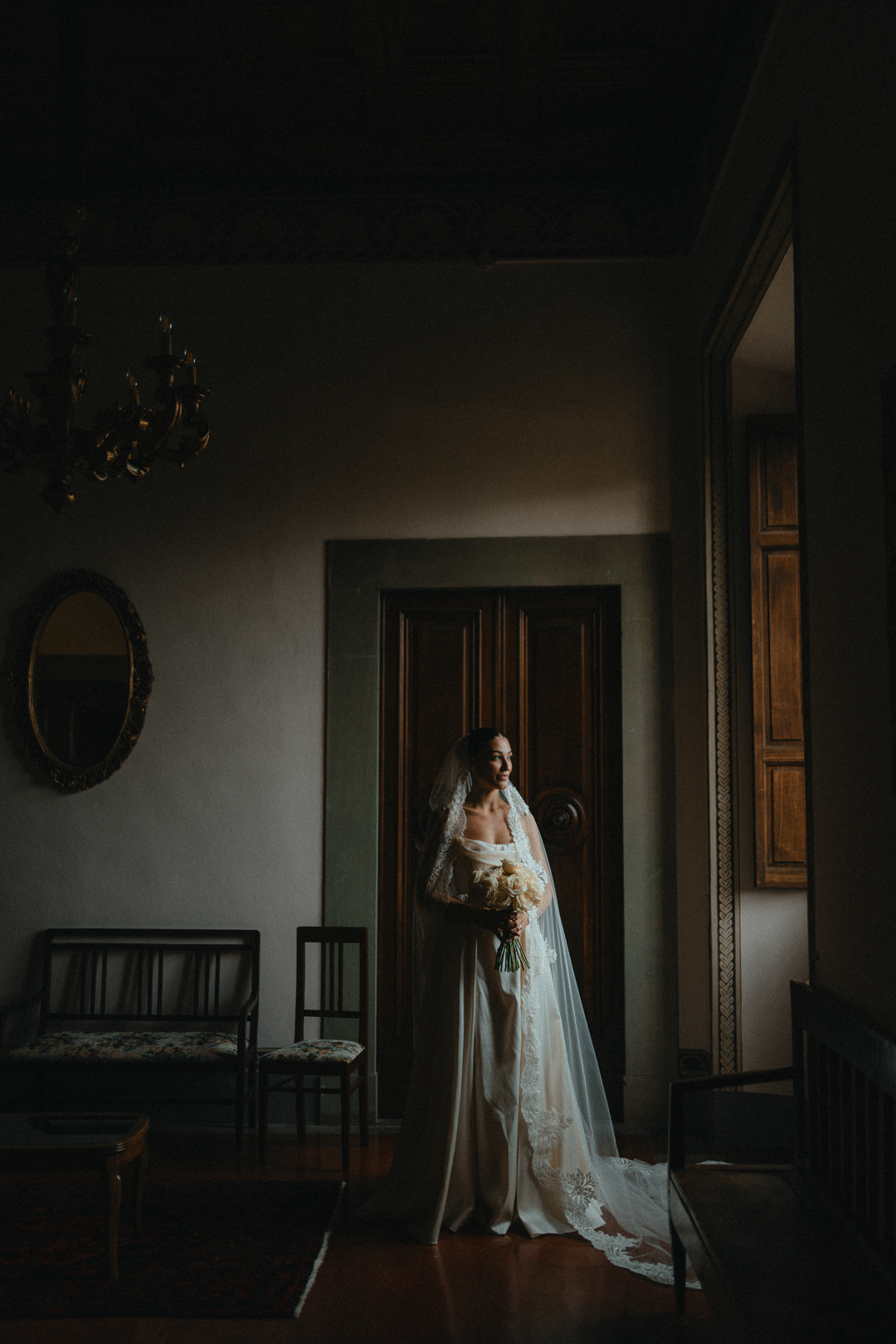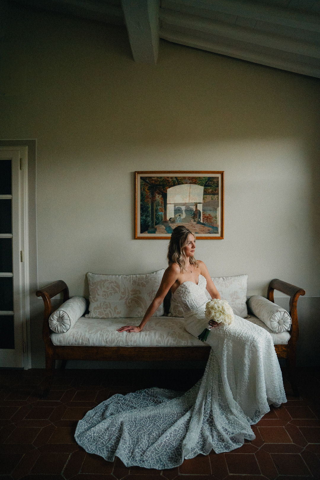 Fotografia di Arianna Macherelli, specializzata in Fotografia di Matrimonio, ritratto ambientato della Sposa con in mano il bouquet sulle scale