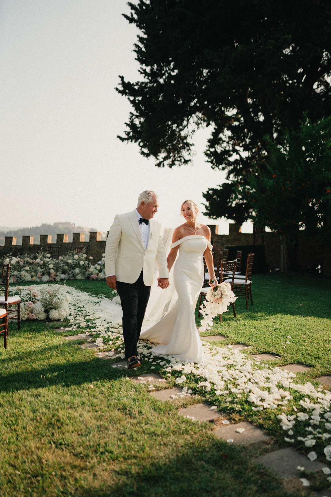 Fotografia di Arianna Macherelli, specializzata in Fotografia di Matrimonio, fotografia di spalle degli sposi mentre camminano mano nella mano immersi nella natura