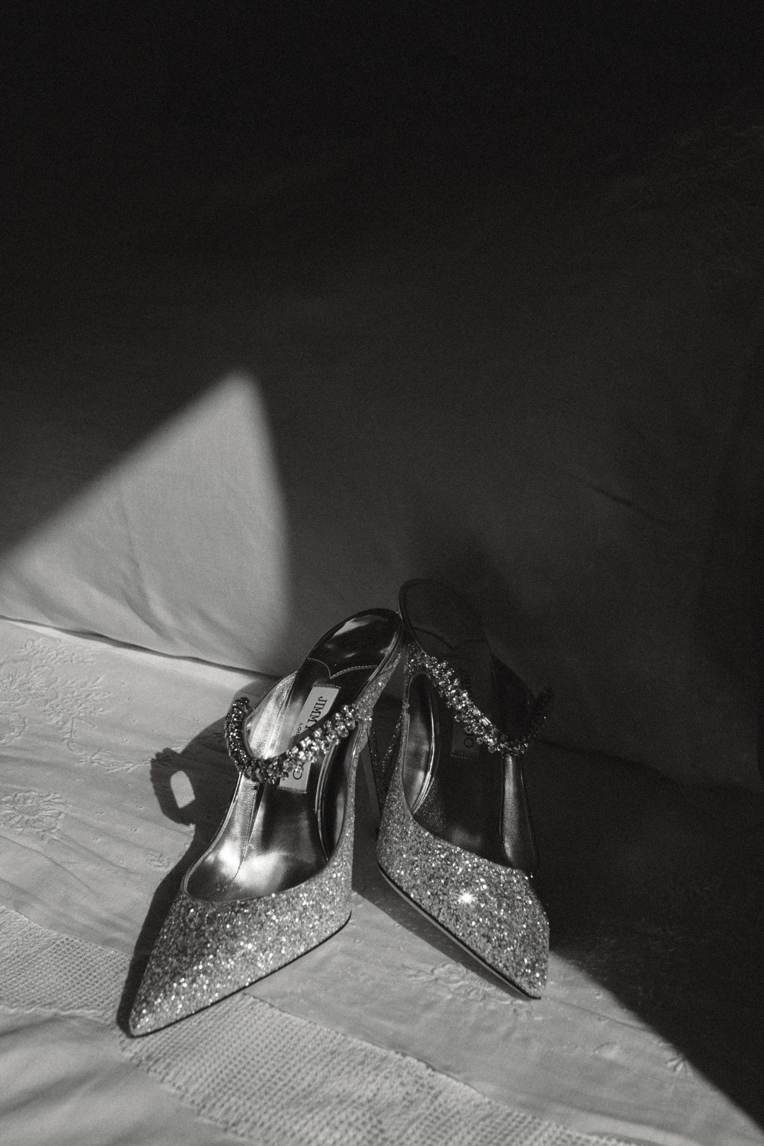 Fotografia di Arianna Macherelli, specializzata in Fotografia di Matrimonio, dettaglio in bianco e nero di reportage con un piede senza tacco di una sposa in preparazione