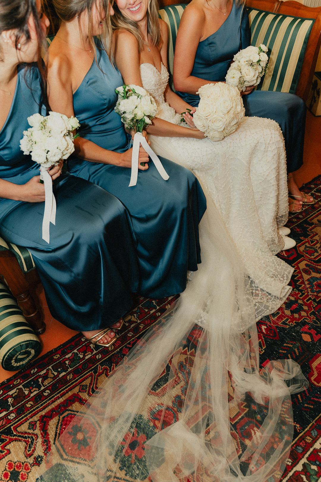 Fotografia di Arianna Macherelli, specializzata in Fotografia di Matrimonio, dettaglio dell'abito della sposa con in mano il bouquet