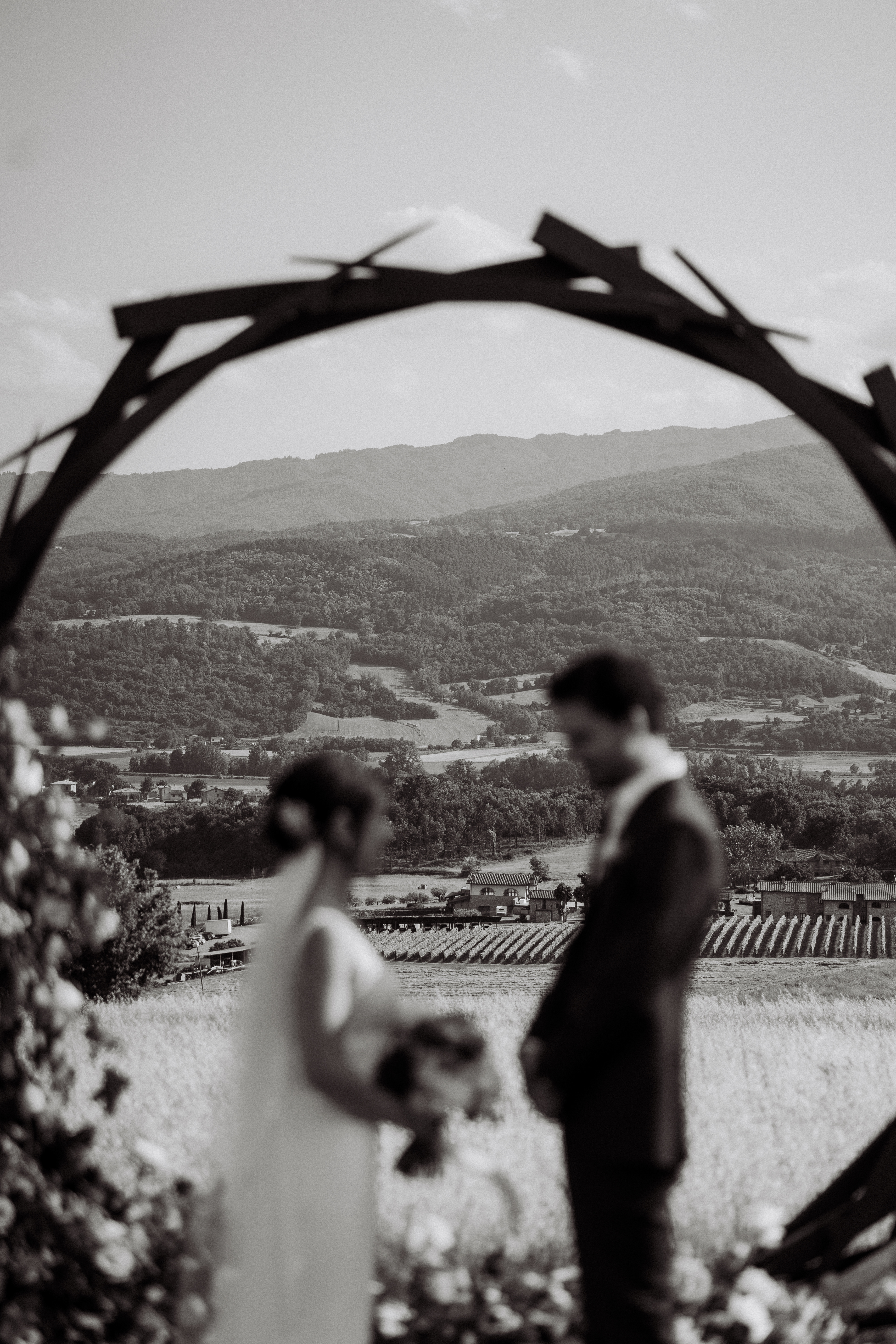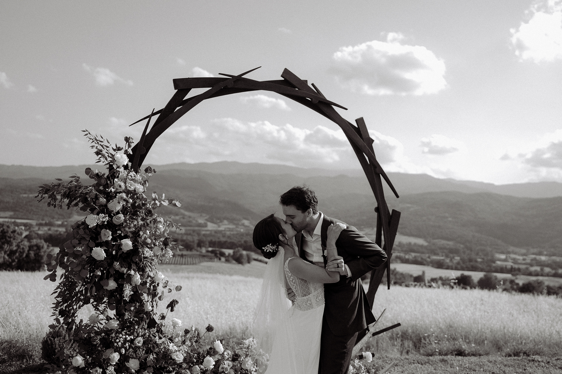 Fotografia di Arianna Macherelli, specializzata in Fotografia di Matrimonio, ritratto del bacio degli sposi con arco fiorito
