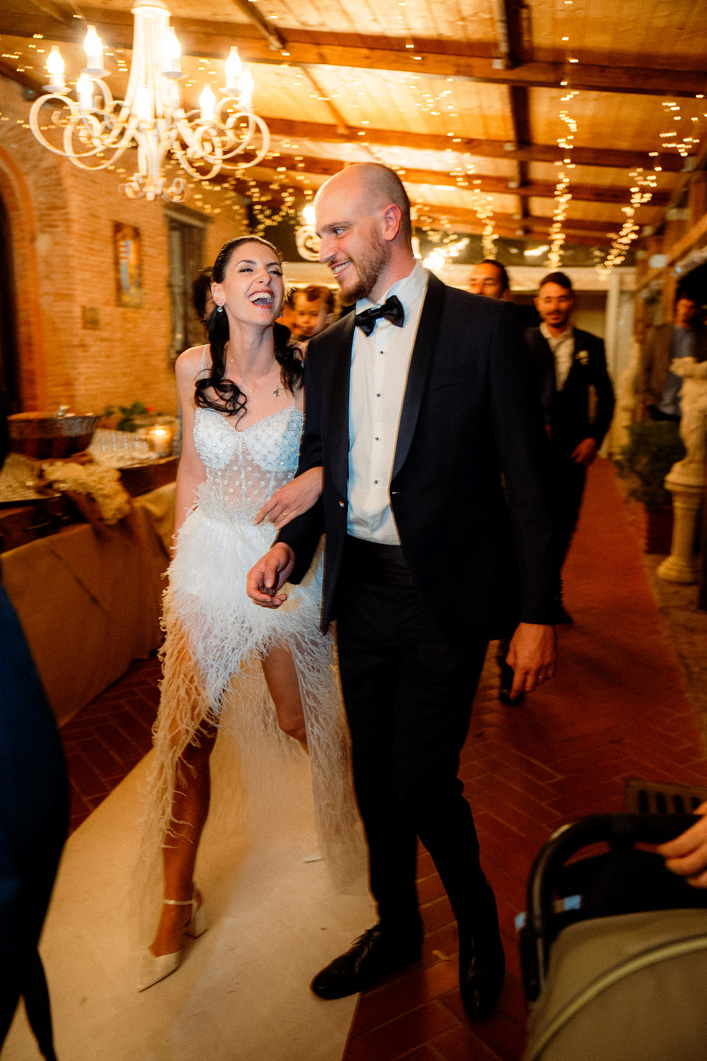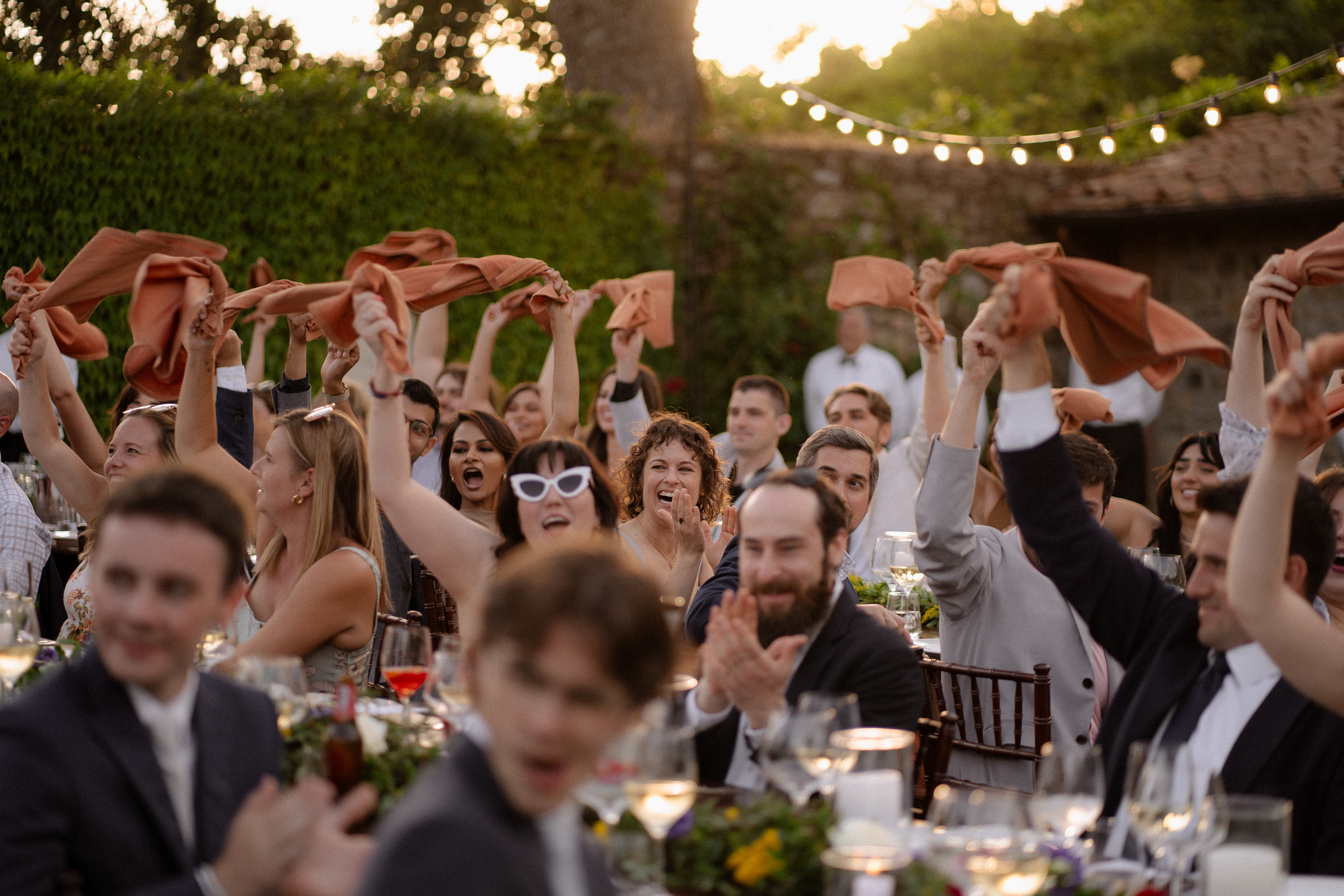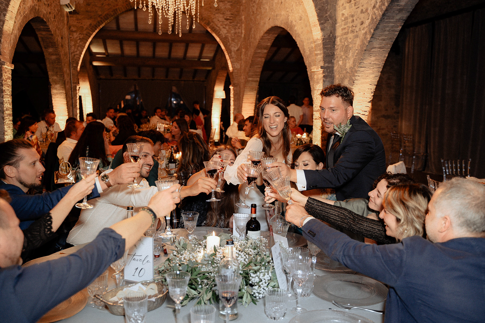 Fotografia di Arianna Macherelli, specializzata in Fotografia di Matrimonio, immagine di reportage della sposa che ammira gli invitati dopo il lancio del riso