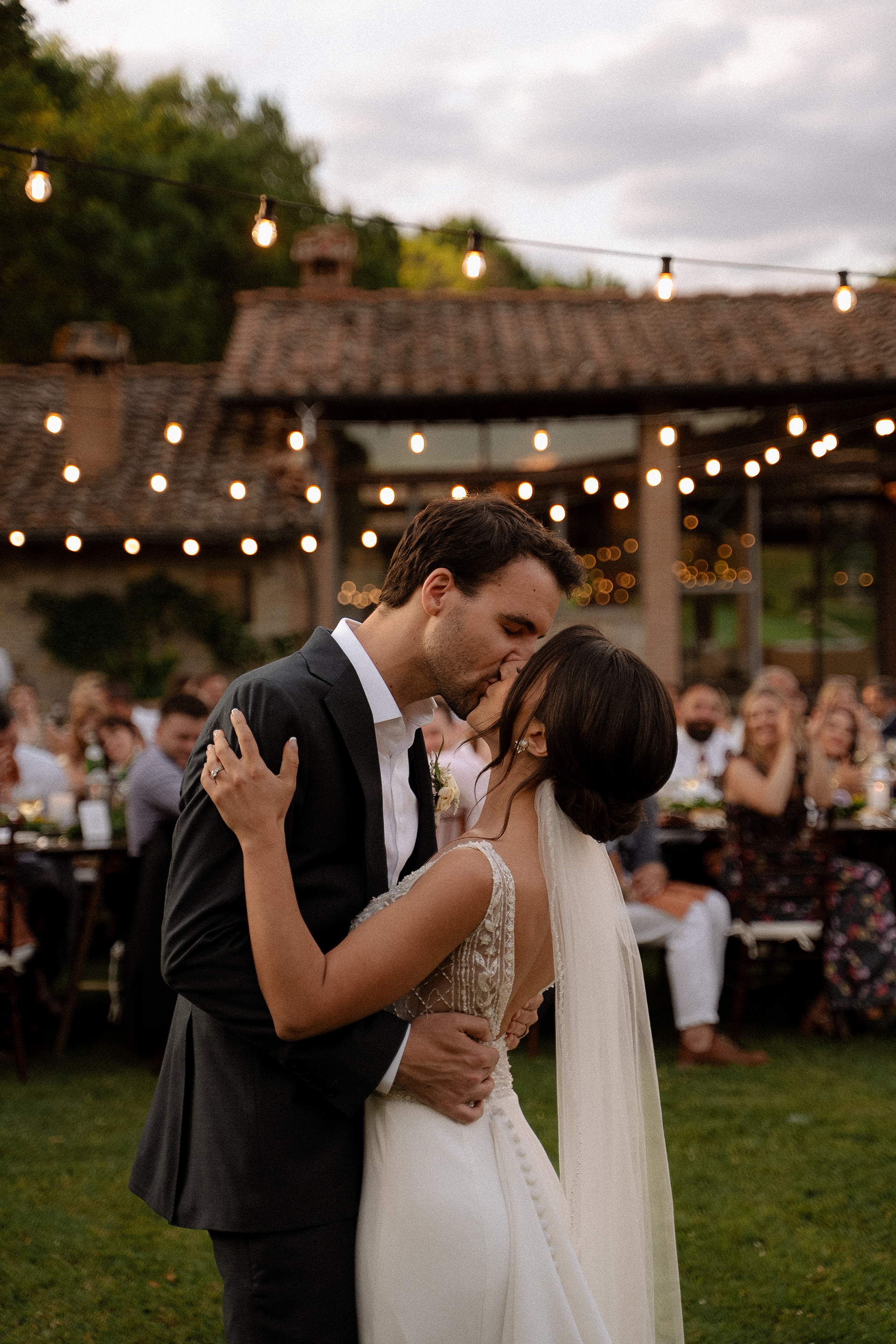 Fotografia di Arianna Macherelli, specializzata in Fotografia di Matrimonio, ritratto del bacio tra gli sposi all'ora del tramonto in controluce